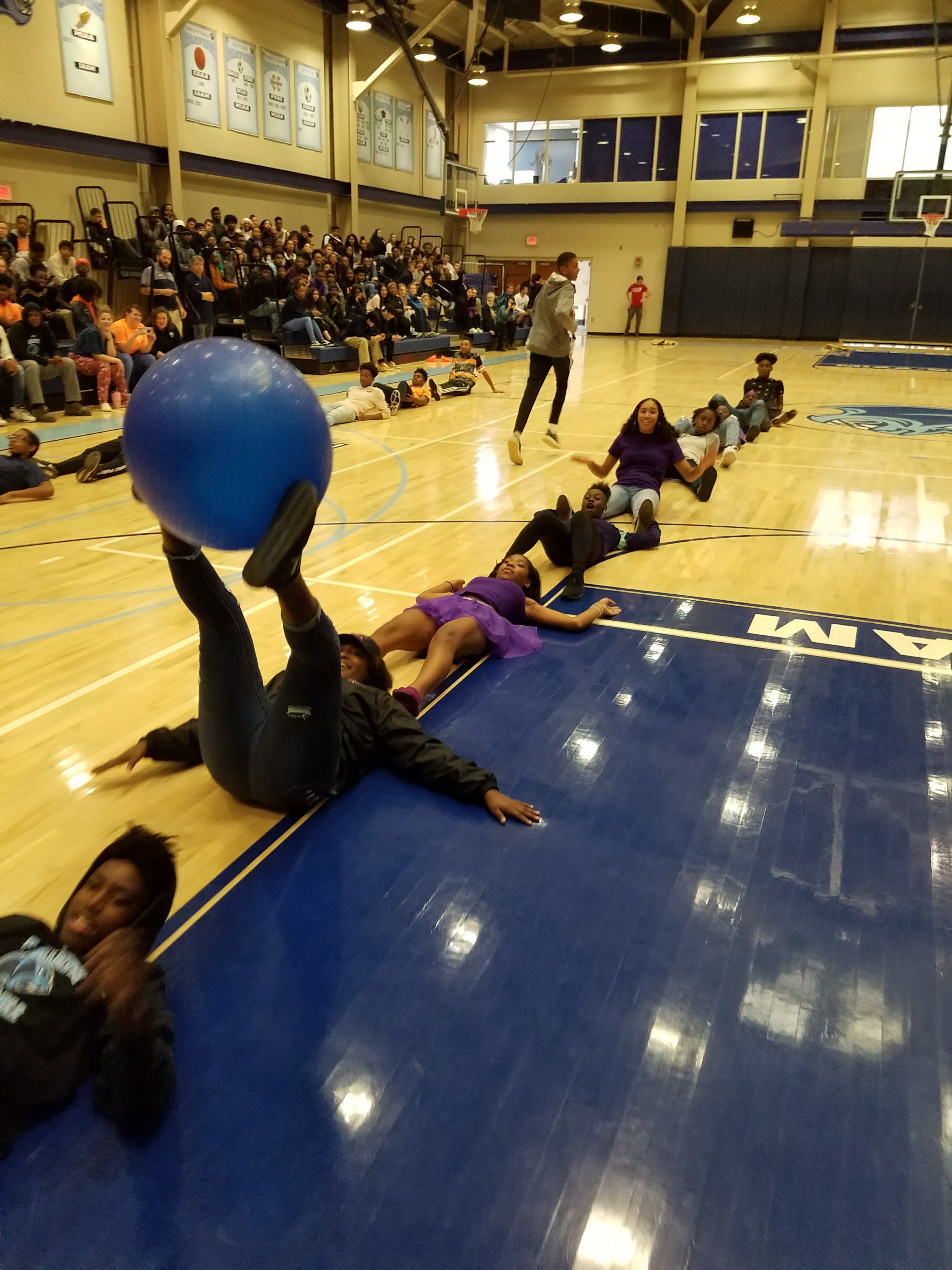 Weather forced the competition indoors and the gym was rocking as the classes filed in, taking their seats, and rocking out to Beyoncé music provided by emcee Tylen Thomas ‘19. With SGA moderator Allison Williams unavailable, Katie Grenchik set up the 10-man relay race.