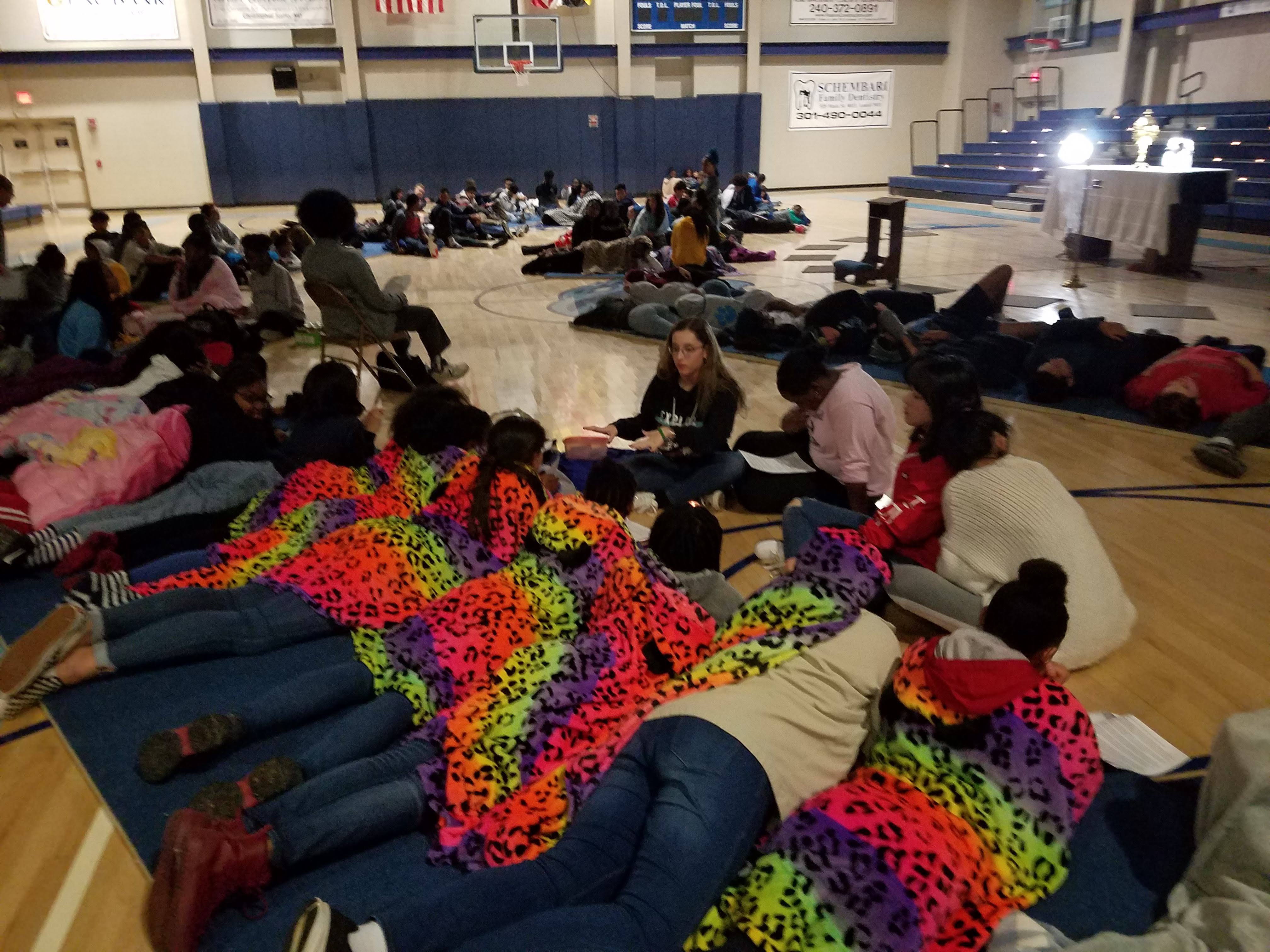 The final gathering was in the gym, with low lights, and an altar as Father Anthony Lickteige led everyone through prayer then made himself available for confession. As he tended to the long line of students, the union leaders met one-on-one with their charges for a final debriefing. Among candlelit bleachers, you could see pairs hugging, or crying, or in deep conversation.