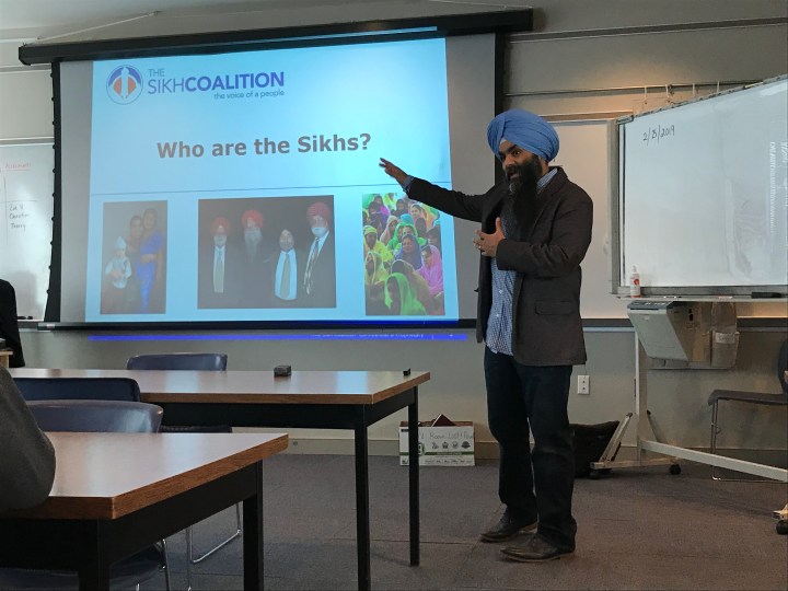 He proceeded to explain the many hardships he has experienced, with most people confusing him with Muslims and treating him as an enemy. Singh spoke of going through airports and walking around the street, especially after 9/11, with people giving him had a hard time. Being accepted in the community has been a challenge, especially in the last few years given the rising racial intolerance. Singh and Bayly are friends and he accepted the invitation to come speak with the classes about how much good Sikhs can do in the world and that they aren’t terrorists.