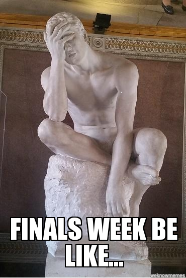 Final exams begin next Thursday and already people are beginning to panic. Seven exams, four days, even with a weekend, appears to be stressing out the students. Fortunately, finals are nothing new and over the years, time-proven strategies have emerged.